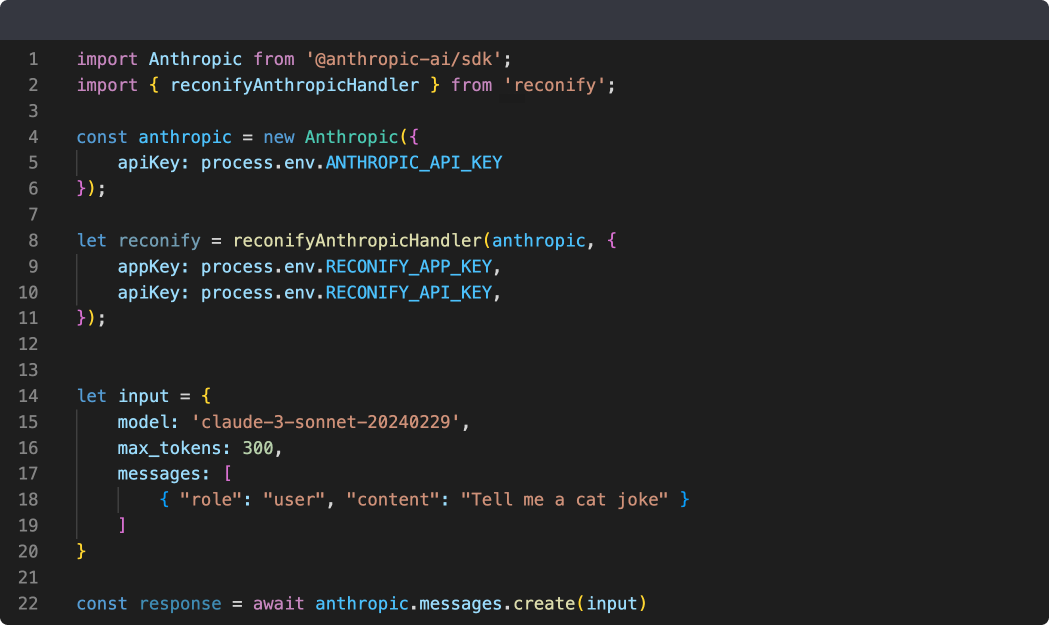 Reconify easily integrates directly with Anthropic via Node NPM, Python PIP, or REST API and via Bedrock as well.