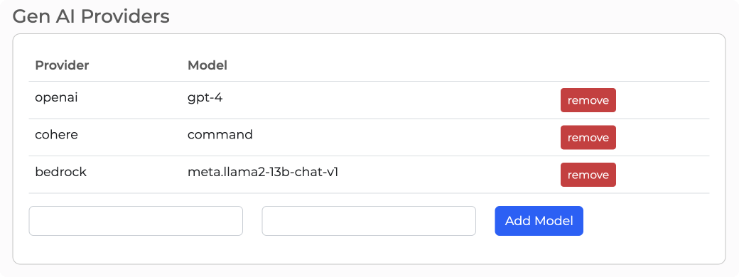 You can select models from Ai21, Amazon Bedrock, Anthropic, Cohere, Google Gemini, Mistral, Meta Llama, OpenAI, and more.
